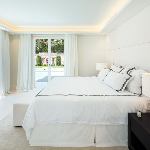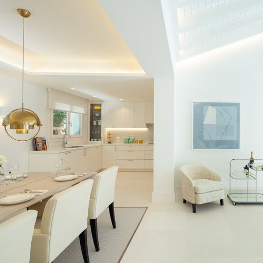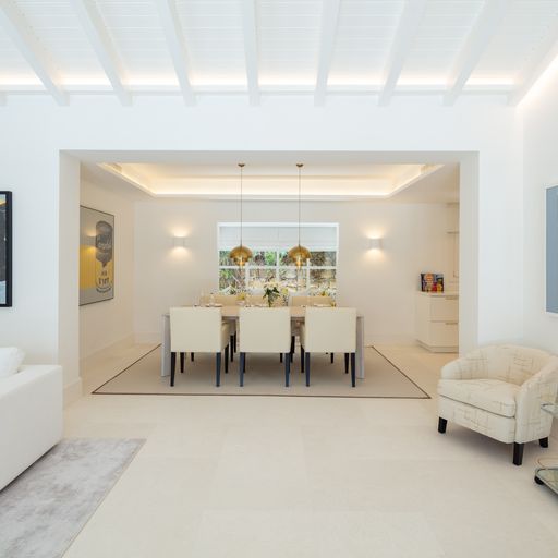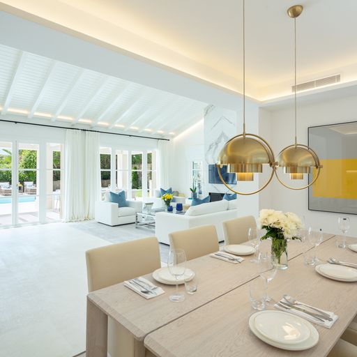 Gyönyörű villa a Golf-völgy szívében! Az előszobán keresztül jutunk a nappaliba melynek közepén egy lenyűgöző kandalló található. A nyitott elrendezésű otthonban a konyha és nappali térből tárul elénk a hátsó kert, fedett verandával, grillezővel és egy hangulatos medencével. Ezen a szinten található még két hálószoba és a főlakosztály gardróbbal és kilátással a medencére és a La Concha hegyre. A földszinten két kényelmes hálószoba helyezkedik el, illetve a mosókonyha, garázs és egy egyedi, második nappali/szórakoztató részleg.