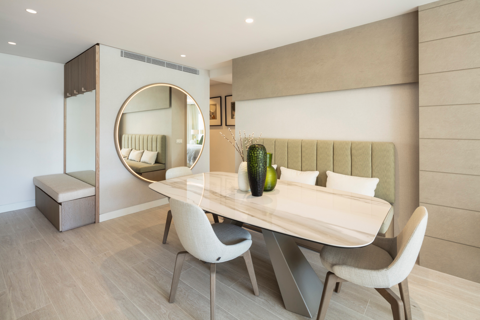 Az étkezőben egy gyönyörű márvány étkezőasztal található, amelyet egy kanapé egészít ki