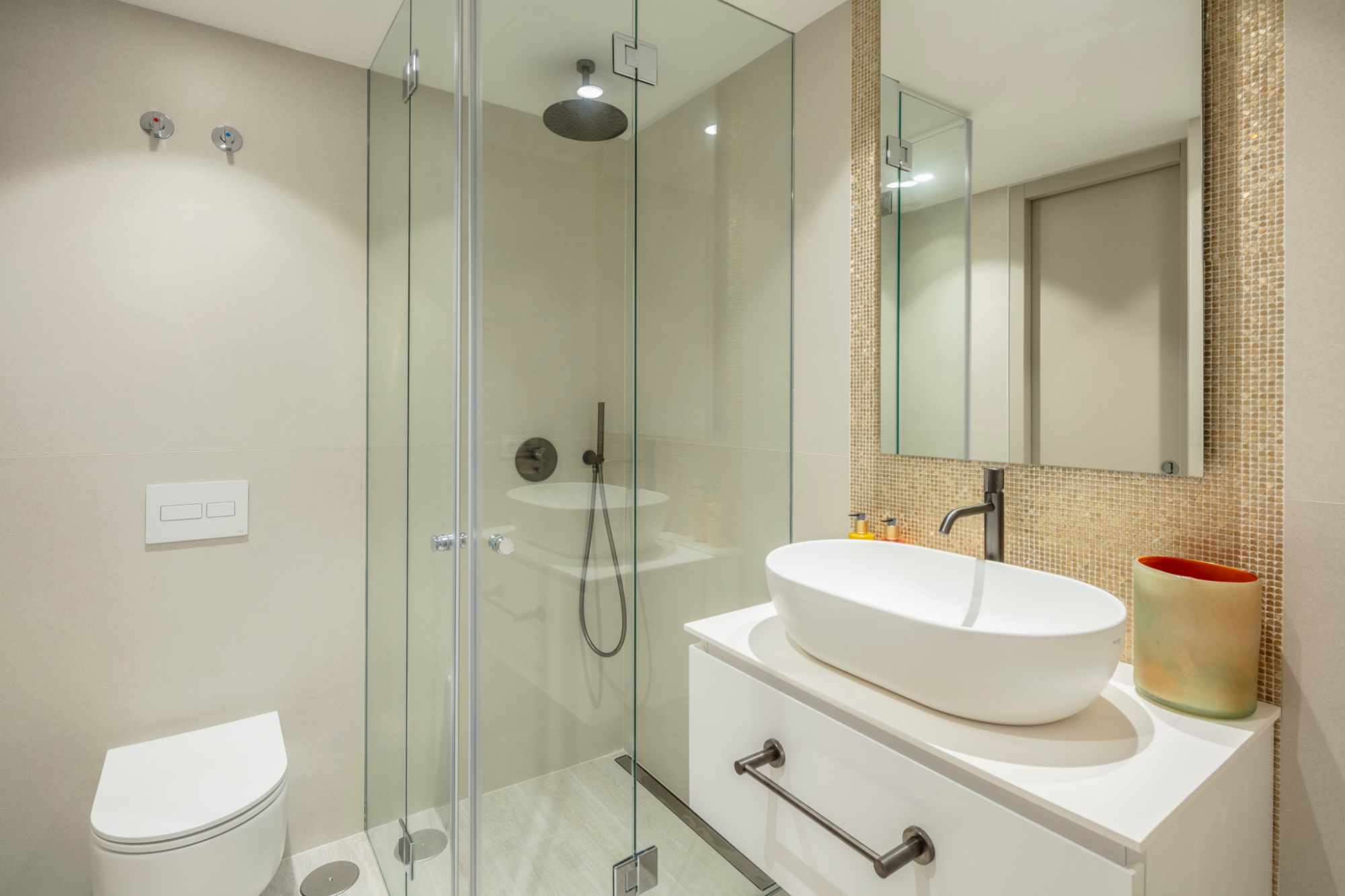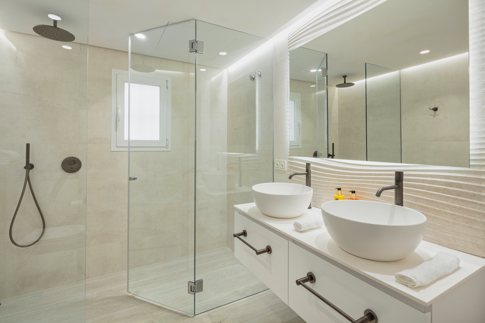 Fürdőszoba funkcionális és stílusos, külön zuhanyzóval, fürdőkáddal és kétszemélyes ággyal