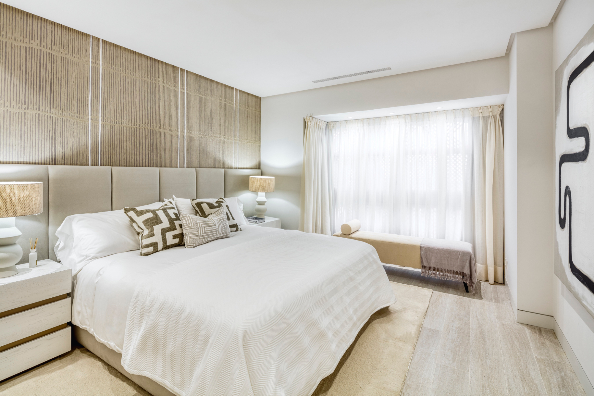 A hálószoba egyaránt lenyűgöző, lenyűgöző dizájnnal és közvetlen teraszkapcsolattal rendelkezik. A